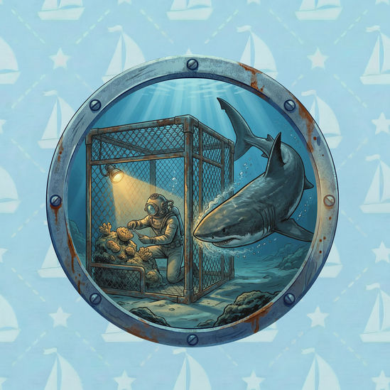 Sailor Sam and his crew visit an island just off the Latin American coast to help an old friend, Chief Pah, whose village of sponge divers is being terrorized by a sudden invasion of killer white sharks. As an abrasive skeptic named Charlie stirs up unrest among the people, Sam must use scientific research and engineering to develop a “People Cage” that allows the divers to work safely while withstanding the force of the massive predators.